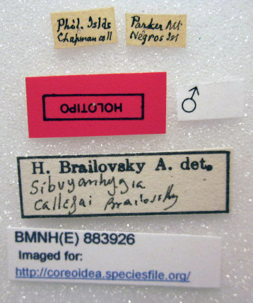 Sibuyanhygia callejai Brailovsky, 1997 (Holotype: male) – BMNH London – (CC BY-NC 3.0) Attribution: The Natural History Museum, London. Photograph taken by Tristan Bantock.