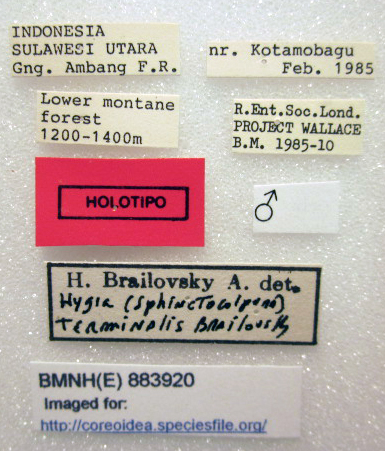 Hygia (Sphinctocolpura) terminalis Brailovsky, 2000 (Holotype: male) – BMNH London – (CC BY-NC 3.0) Attribution: The Natural History Museum, London. Photograph taken by Tristan Bantock.