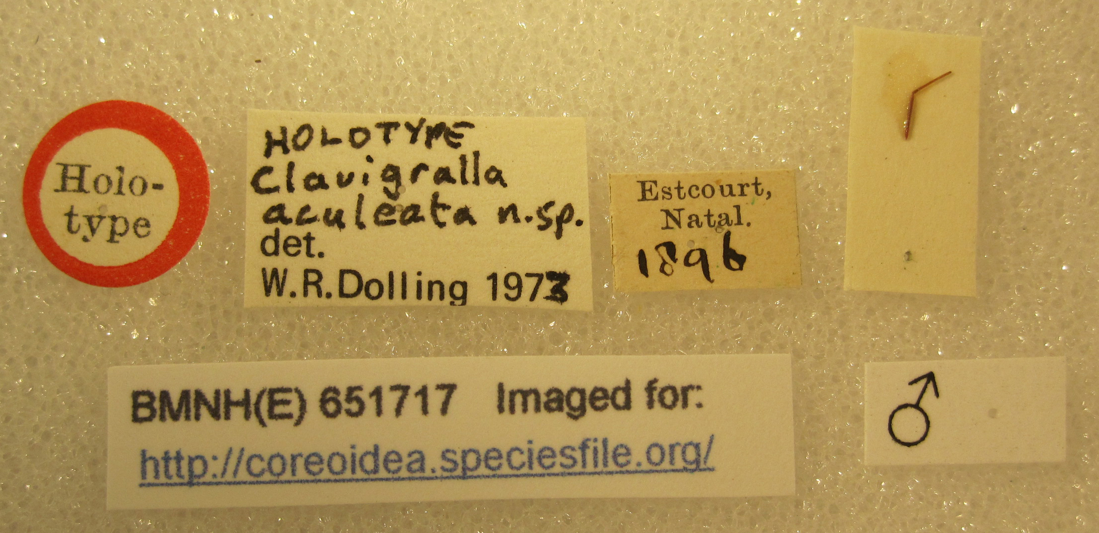 Clavigralla aculeata Dolling, 1979 (Holotype: male) – BMNH London – (CC BY-NC 3.0) Attribution: The Natural History Museum, London. Photograph taken by Laurence Livermore.