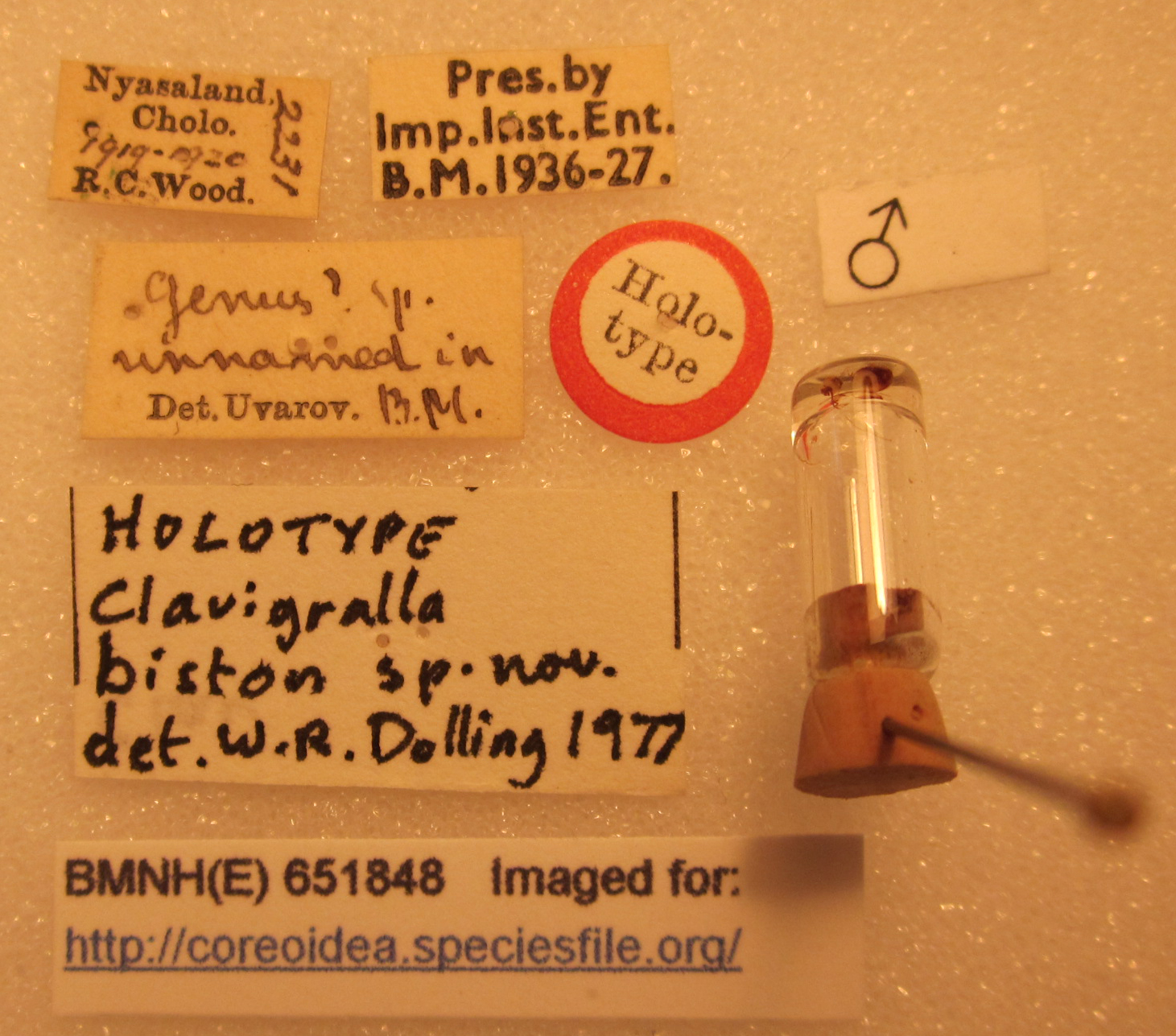 Clavigralla biston Dolling, 1979 (Holotype: male) – BMNH London – (CC BY-NC 3.0) Attribution: The Natural History Museum, London. Photograph taken by Tristan Bantock.