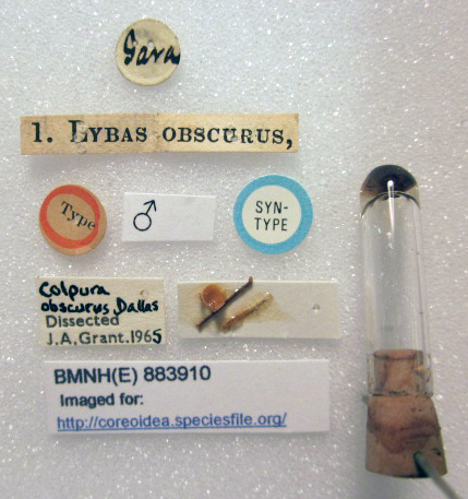 Lybas obscurus Dallas, 1852 (Syntype: male) – BMNH London – (CC BY-NC 3.0) Attribution: The Natural History Museum, London. Photograph taken by Tristan Bantock.